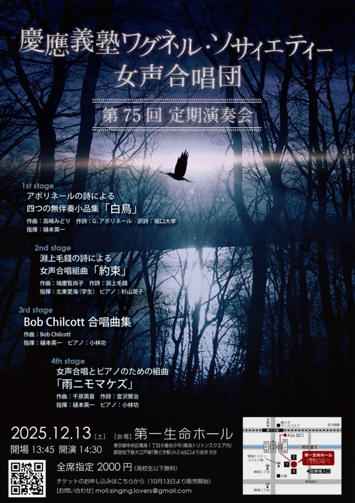 チケットはこちらから→https://teket.jp/4341/54792。愛称「モル」=moll。ちなみに、それに対する男声合唱団の愛称は「ドゥア」=Dur。ドイツ語で短調と長調という意味です。インカレではなく、慶應義塾大学の学生のみによる女声合唱団。第二次世界大戦後まもなくに結成され、定期演奏会はついに第75回の記念を迎えました。多彩な演目と確かな実力で皆様をお迎えします。
